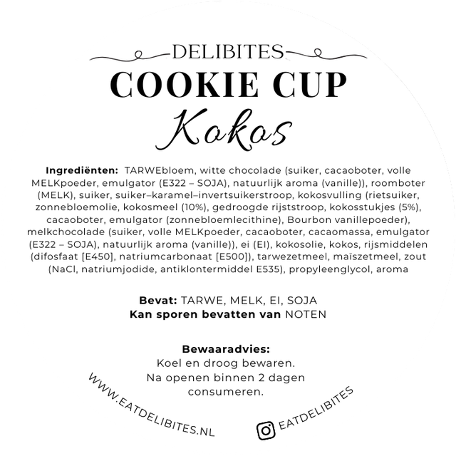 Onze Coconut Cookie Cup begint met een zachte, goudbruine cookie waarin stukjes witte chocolade zijn meegebakken. De buitenkant is licht krokant, de binnenkant heerlijk zacht.