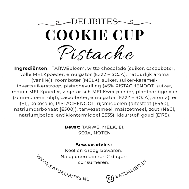 Als finishing touch is de cookie afgewerkt met fijne stukjes pistache en subtiel afgewerkt met een vleugje bladgoudvoor een elegante, luxe uitstraling.